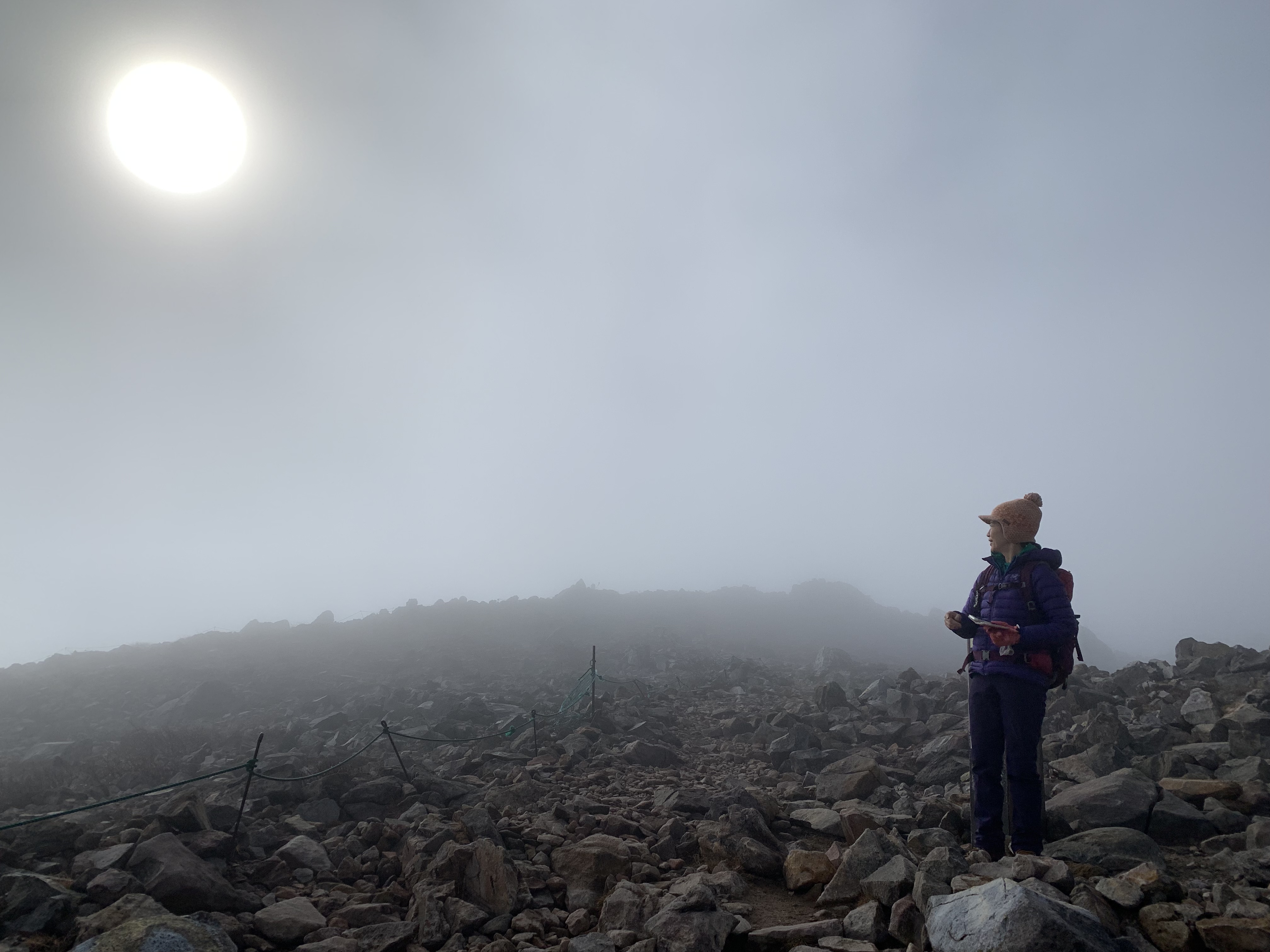 ガスガスの中、朝日岳と茶臼岳を登りました。風によって時折見える景色に感動を覚える。