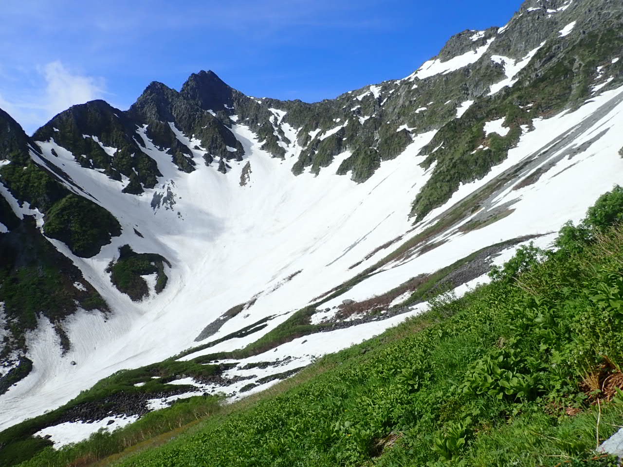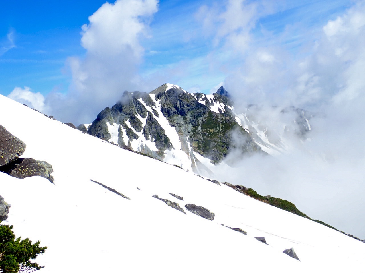 陽光に輝く残雪、青空にそびえ立つ岩峰、切り立った岩壁に咲く花々を、心置きなく愛でながら、私たちパーティの独占状態で北穂高岳の頂を踏むことのできた、とても素晴らしい山行になりました。